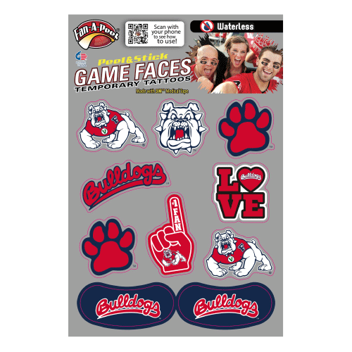 Add some Fresno State flair on game day with the Face Decals Combo Pack! This set of 10 face stickers are easy to apply and easy to remove! Featuring the 4Paw Bulldog logo, Dog Face logo, Paw Print logo, Bulldogs Script logo, eye black decals, and more!