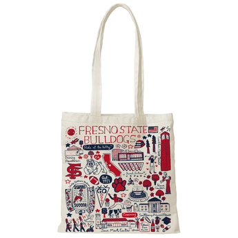 Take the Bulldogs with you with the Julia Gash Tote! This large, flat, canvas tote measures out at 15.5" x 15.5" inches and features drawn Fresno State iconography features logos, The Savemart Center, Valley Children's Stadium, the Carillon Clock Tower, Peace Garden, agriculture, and so much more! There is no way to show off your valley pride - Go Dogs!