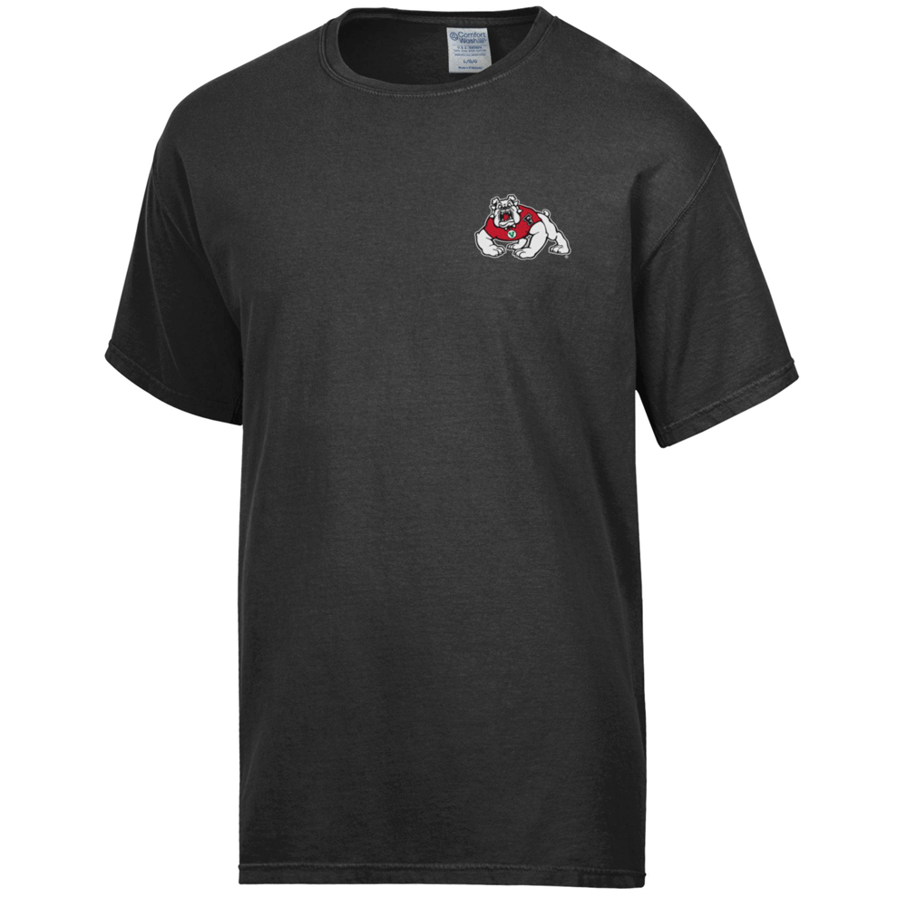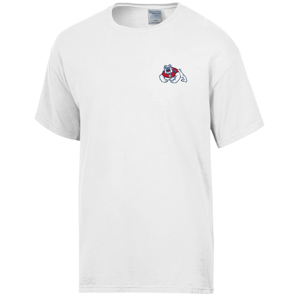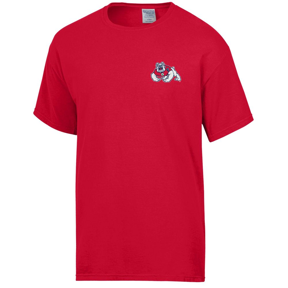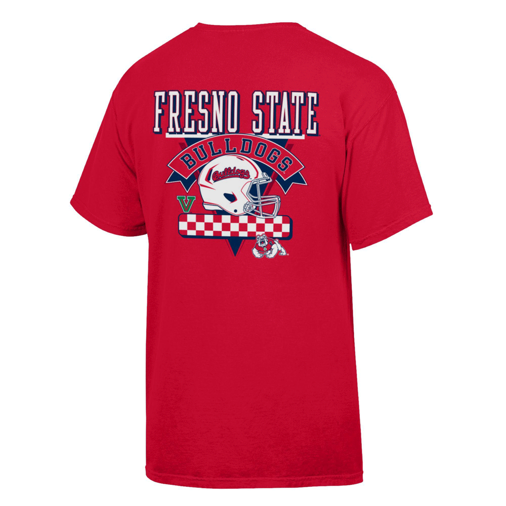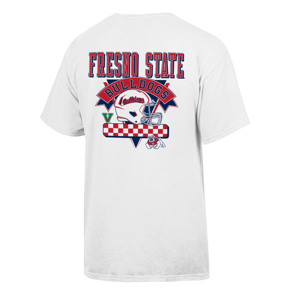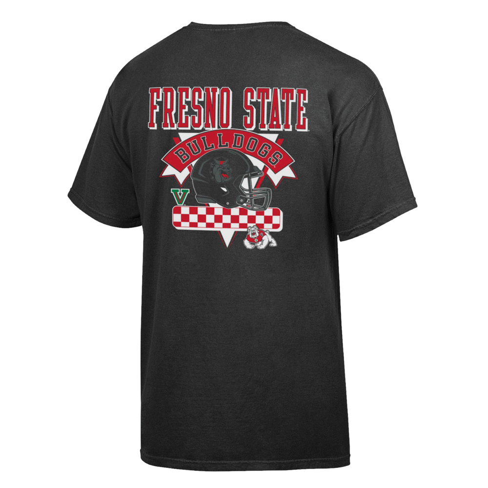 Show off your Fresno State pride with the Check With Me Tee! This ultra soft, 100% cotton "comfort wash" t-shirt has a screenprinted design on both sides, proudly showcasing a Primary 4Paw Bulldog logo on the left chest and a large back design featuring a "Fresno State" wordmark, "Bulldogs" on a banner, a white Bulldogs Script football helmet, a Green V logo, a red and white checkerboard pattern, and another 4Paw Bulldog logo to tie it all together.