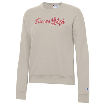 Represent the Bulldogs in comfort and style with the Fresno State Script Crew! This Women's Champion Powerblend Fleece crewneck sweatshirt is made of a 50% cotton / 50% polyester blend and features an embroidered chenille design showcasing a stylized "Fresno State" script wordmark in red and navy. Go Dogs!