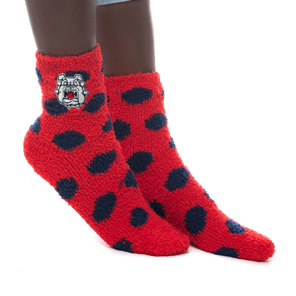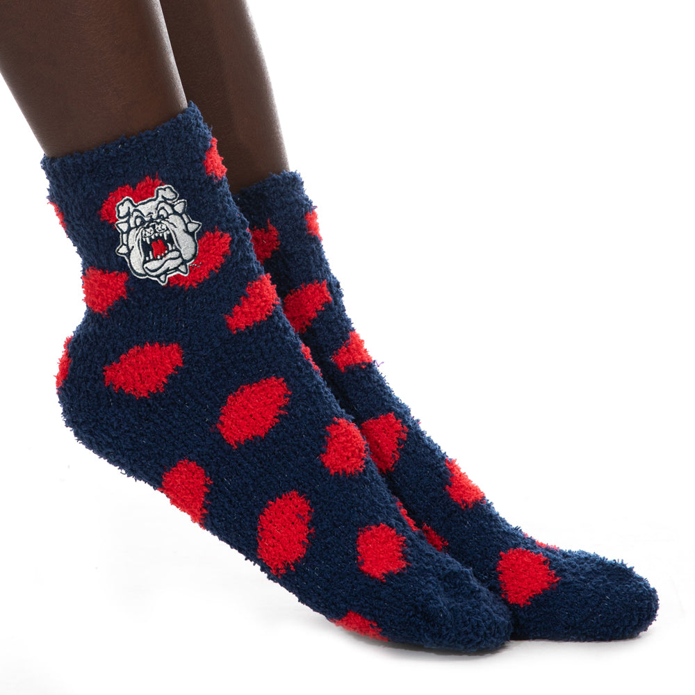 Keep warm and cozy while representing the Red Wave with the Fuzzy Dot Socks! This ultra soft fuzzy Fresno State socks fit women’s shoe sizes 6-11 and feature a polka dot pattern as well as an embroidered Dog Face logo. Available in red or navy – Go Dogs!
