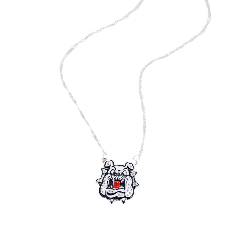 Shine on with the Dog Face Necklace! This Fresno State necklace features silver enamel and crystals on a silver tone Dog Face pendant. Wear it alone or pair it with our matching Fresno State mascot earrings, bracelet, and stretch ring for a full fan look! Necklace measures 16" with a 3" extender.