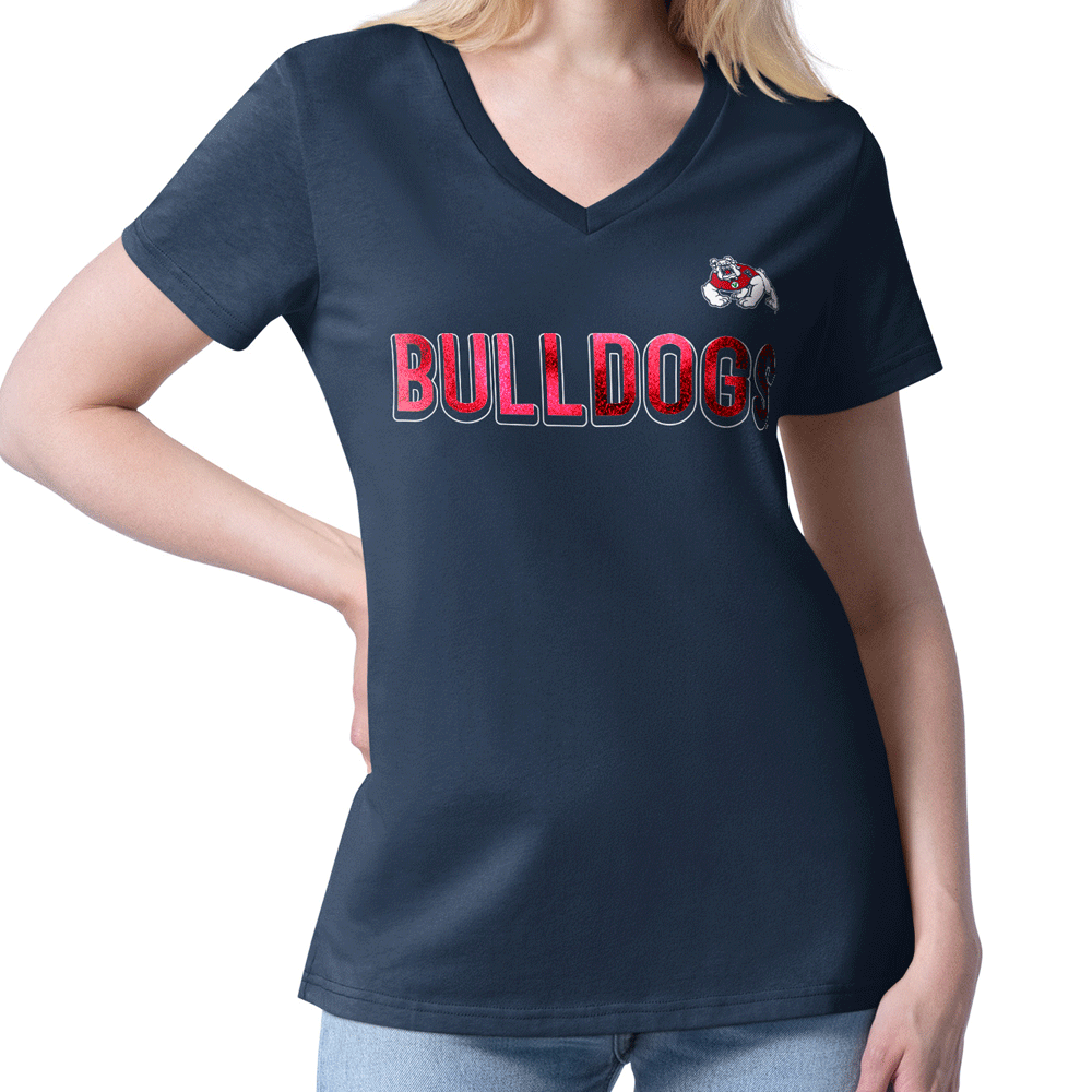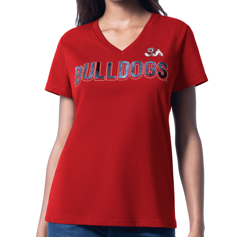Represent the Red Wave with the Top Dog V-Neck! This women's top features a screen printed design featuring a "Bulldogs" wordmark outlined in white with a glitter overlay, as well as a primary 4Paw Bulldog logo for extra flair. Perfect for game day - Go Dogs!