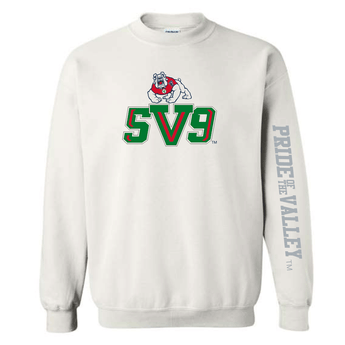Get ready for the White Out versus Utah State with the 5V9 Crewneck! This comfortable unisex crewneck sweatshirt is made of a cotton blend and features a screenprinted design proudly showcasing a Primary 4Paw Bulldog logo paired with the special edition "5V9" logo up front, along with a grey Pride Of The Valley wordmark on the sleeve. Go Dogs!