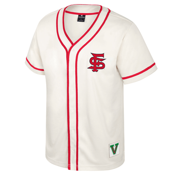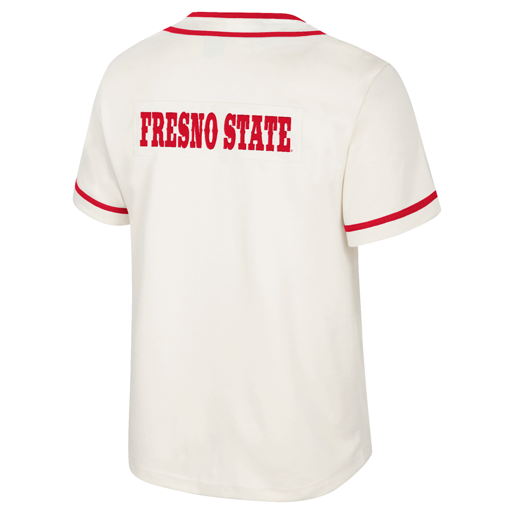Represent Fresno State Baseball with the Diamond Dogs Jersey! This heavy polyester jersey features an embroidered design proudly showcasing an FS Monogram logo on the left side of the chest and a "Fresno State" wordmark across the back. as well as a patch on the bottom of the front-left showcasing a printed Pride of the Valley "V" logo. Perfect for game day - Go Dogs!