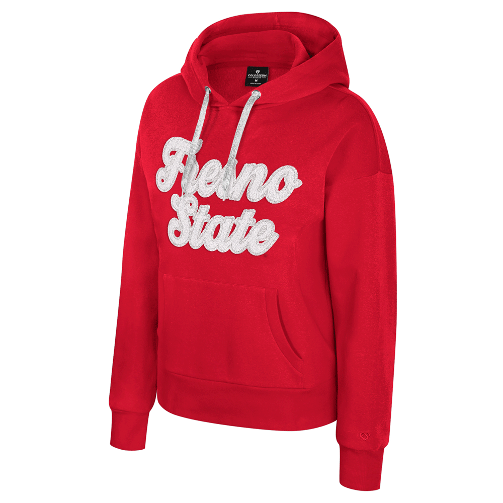 Show off your Fresno State pride with the Glamour Hoodie! This women's sweatshirt is made of a comfortable cotton / polyester blend and features an embroidered glitter design proudly showcasing a stylized "Fresno State" script wordmark, as well as matching glitter drawstrings. Go Dogs!