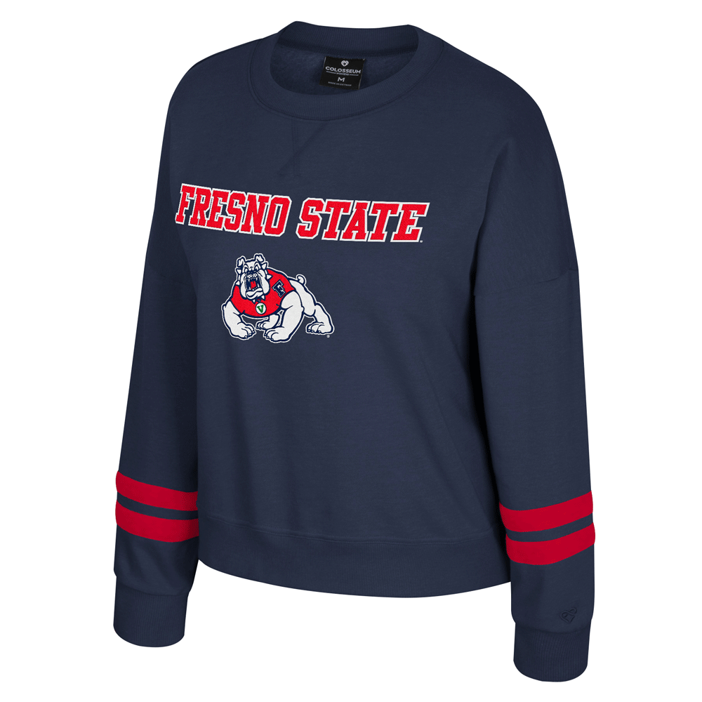 Show off your Fresno State pride with the Sleeve Stripes Crew! This women's crewneck sweatshirt is made of a cotton / polyester blend, features dropped shoulders, applique sleeve stripes, and an embroidered design proudly showcasing a primary 4paw Bulldog logo with a red and white "Fresno State" wordmark. Go Pack!