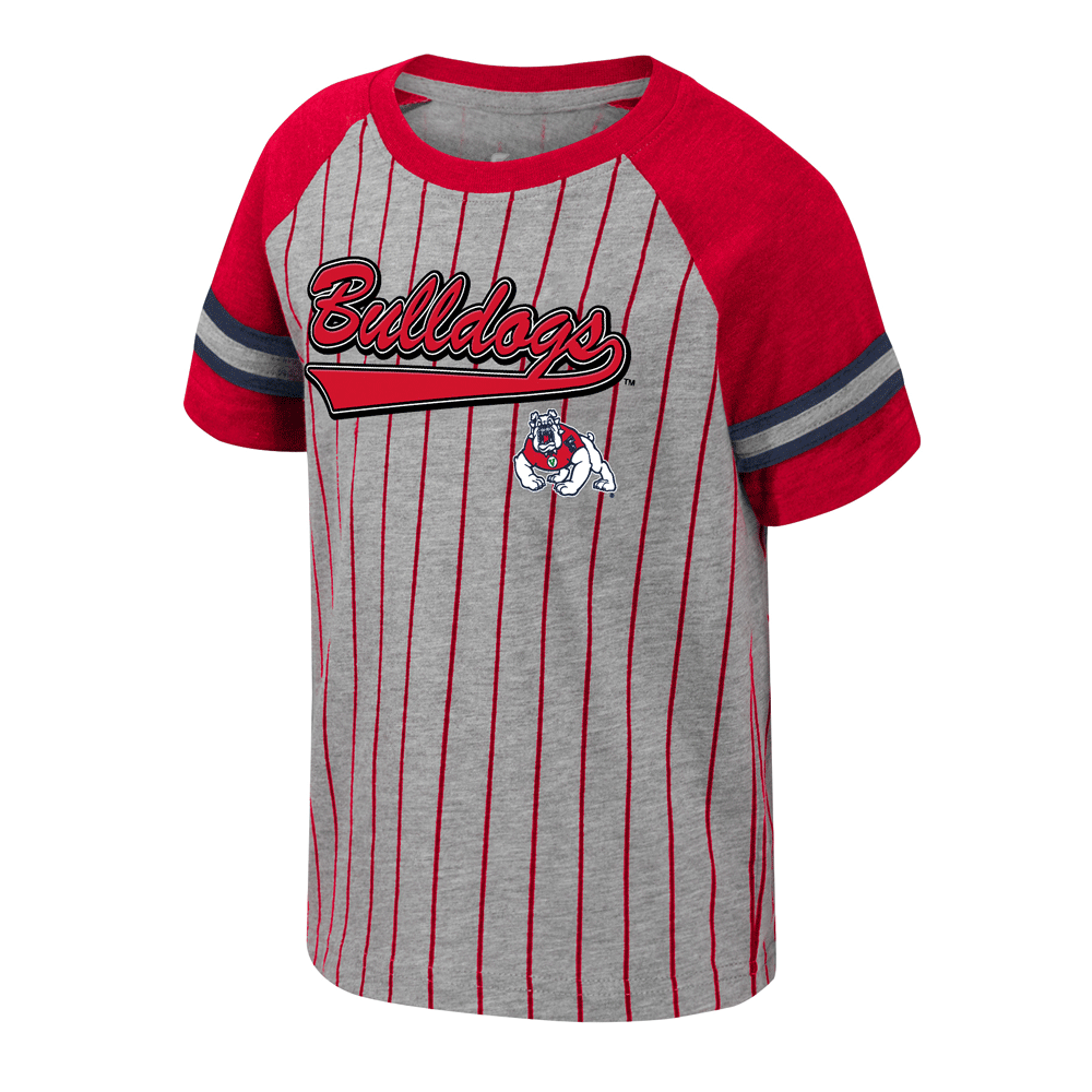 Dress your tiny Bulldog fan with the Toddler Pinstripes Tee! This toddler sized t-shirt is made of a comfortable cotton / polyester blend, and features sublimated pinstripes, applique sleeve stripes, and a screenprinted design proudly showcasing a stylized "Bulldogs" script logo along with a 4Paw Bulldog logo. Perfect for game day!