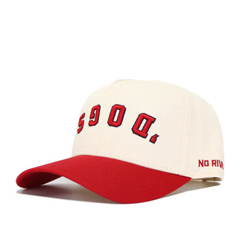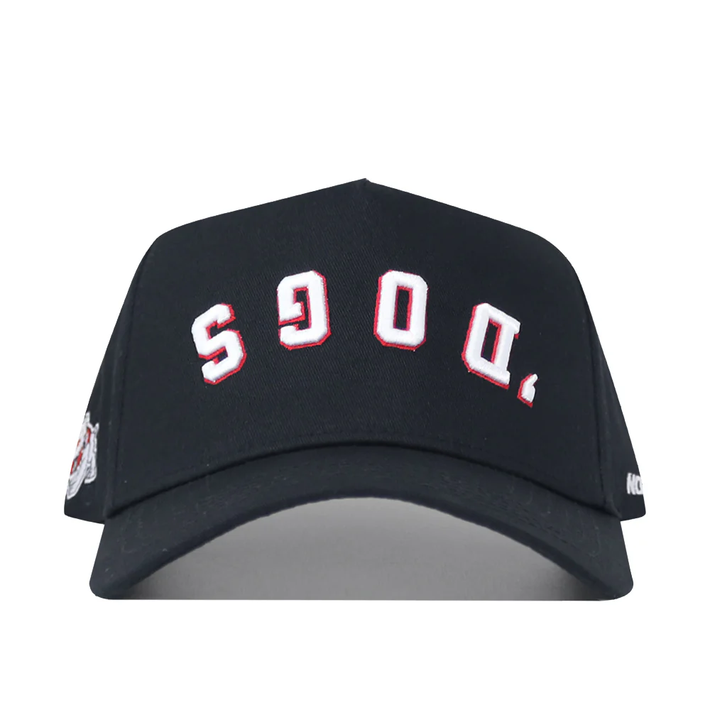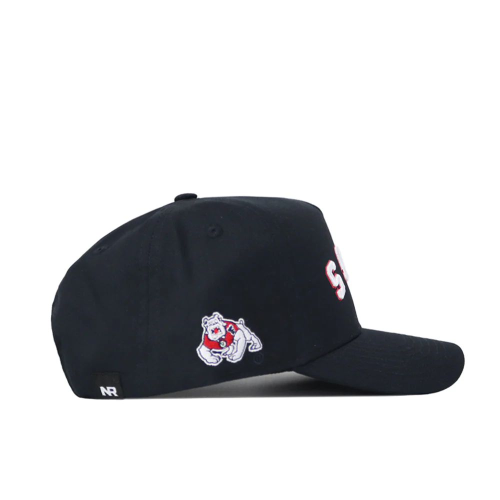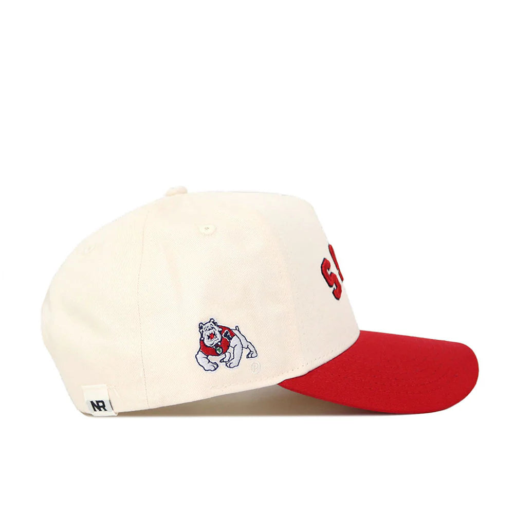 Represent the Bulldogs in style with the Upside Down Dogs hat! This ivory and red colored Fresno State hat is made of high quality cotton and features an adjustable snap back as well as embroidered details proudly showcasing an upside down and arched "'Dogs" wordmark up front as well as a 4Paw Bulldog logo and "No Rivals" logo on the sides. Available in black too! Go Dogs!