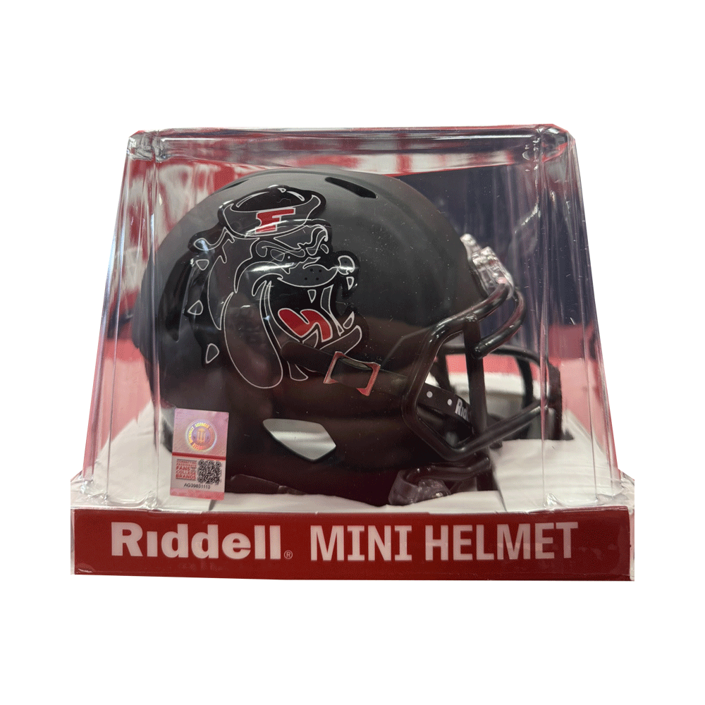 Represent Fresno State Football with the Vault Dog Mini Blackout Helmet! These novelty miniature helmets are approximately 5.5" in size and are modeled after a Riddell Speed Shell, matching the helmets worn on field during the 2025 Black Out game! Featuring a throwback Sailor Bulldog logo on the sides and a Pride of The Valley logo on the back. Perfect for the office or your man cave - Go Dogs!