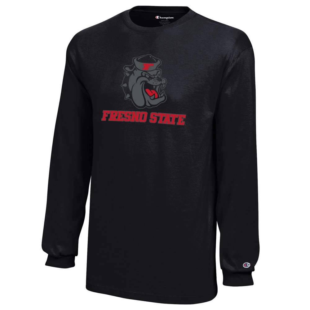 Get your young Bulldogs fan ready for the Blackout with the Youth Champion Blackout LS! This 100% cotton long sleeve shirt features a screenprinted design proudly showcasing a Sailor Bulldog logo in charcoal and red along with a "Fresno State" wordmark. Go Dogs!