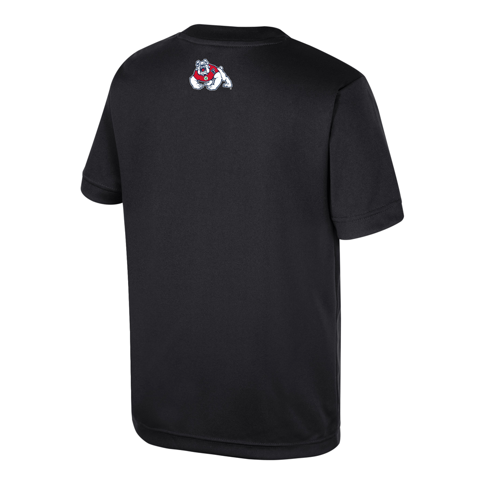 Dress your young Bulldog fan with the Youth No Huddle Tee! This sleek kids' t-shirt is made of 100% polyester and features a rubberized print design proudly showcasing a Dog Face logo along with a gradient filled "Fresno State" wordmark, as well as a black and red "Bulldogs" wordmark. Perfect for game day!
