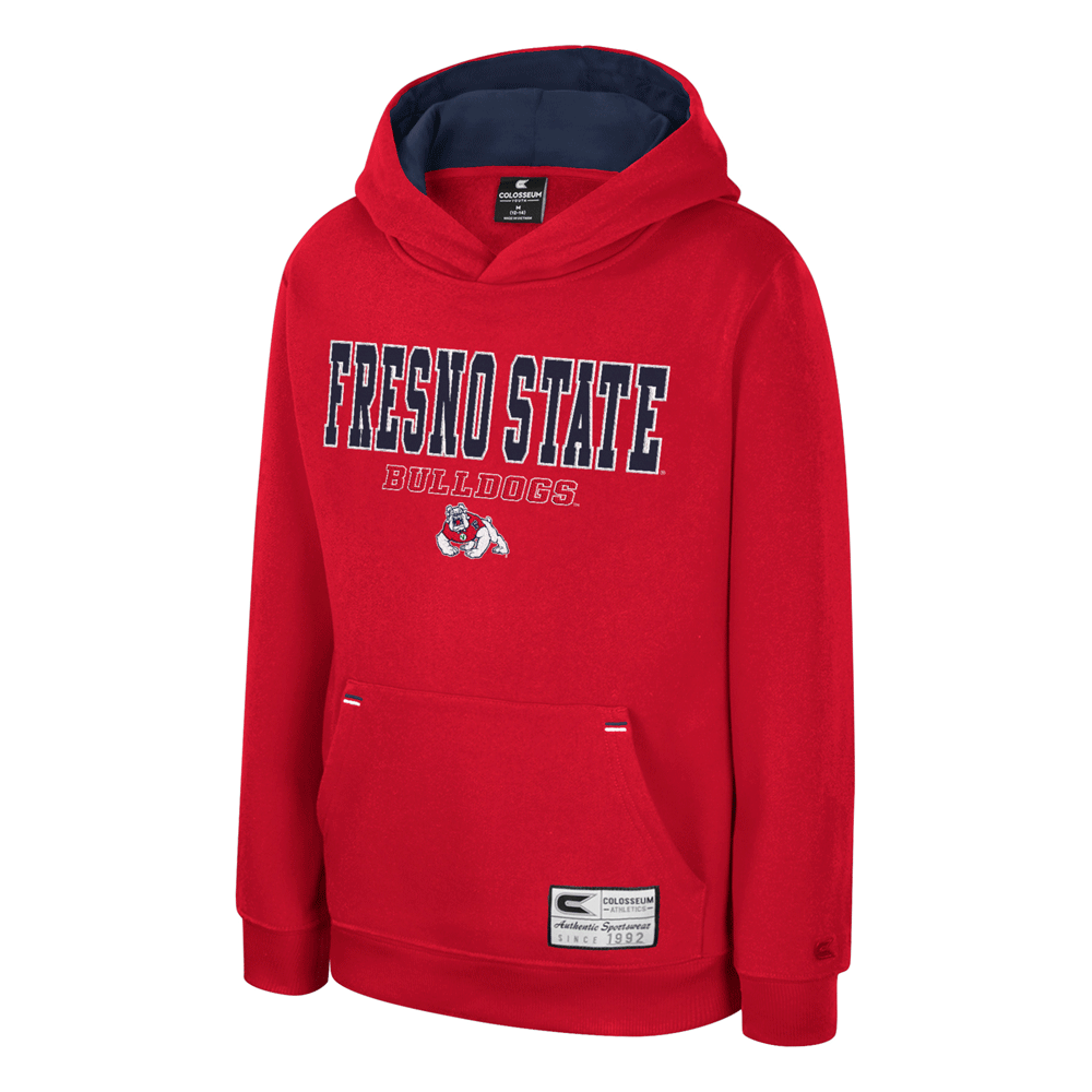 Keep your young Bulldog fan warm with the Youth Statement Hoodie! This youth sized sweatshirt is made of a comfortable cotton/polyester blend and features an embroidered design proudly pairing a Primary 4Paw Bulldog logo with "Fresno State" in navy and white. This hoodie also features a contrasting navy hood lining, white accents on the pocket, as well as a Colosseum patch. Go Dogs!